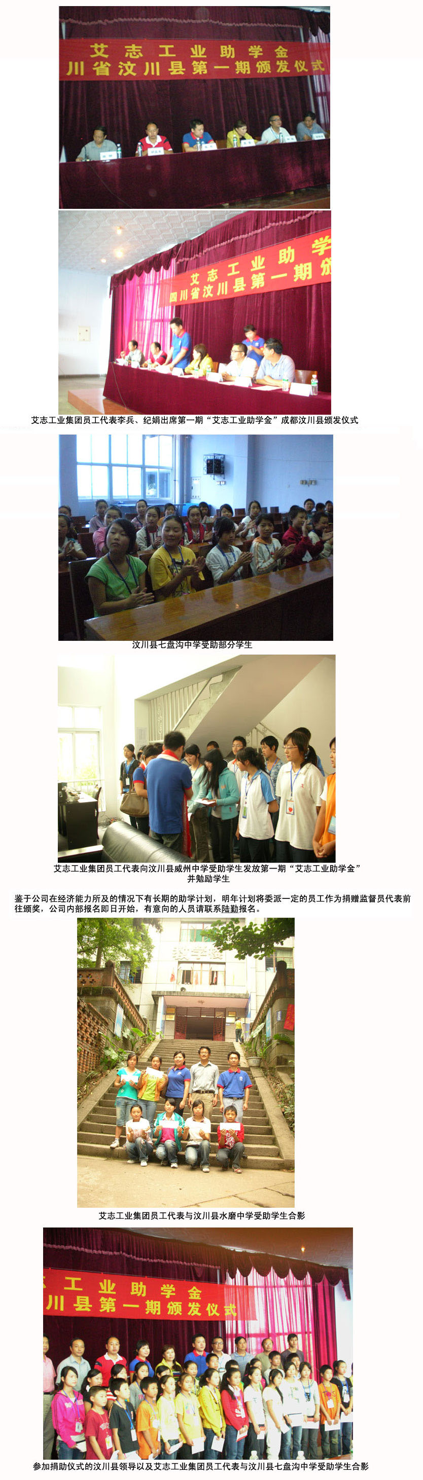 繼2008年8月29日艾志工業(yè)技術(shù)集團(tuán)有限公司在甘肅秦安縣第五中學(xué)頒發(fā)了第一期“艾志工業(yè)助學(xué)金”后,艾志工業(yè)技術(shù)集團(tuán)公司成都辦員工李兵、紀(jì)娟于9月12日上午九點(diǎn),在成都青龍場西南石油大學(xué)汶川縣七盤溝九年一貫制中學(xué)臨時安置點(diǎn)參加了第一期“艾志工業(yè)助學(xué)金”四川汶川頒發(fā)儀式。當(dāng)?shù)卣托7綄?span style="font-family:Verdana">艾志工業(yè)技術(shù)集團(tuán)有限公司的善心表示熱烈歡飲和衷心感謝,汶川縣人民政府副縣長王霞等有關(guān)領(lǐng)導(dǎo)出席了“艾志工業(yè)助學(xué)金”的頒發(fā)儀式并發(fā)表講話。