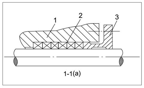 常用填料密封結(jié)構(gòu)如圖1-1(a)所示,填料密封由填料2裝于填料函1內(nèi),通過填料壓蓋3將填料壓緊在軸的表面。由于軸表面總有些粗糙,其與填料只能是部分貼合,而部分未接觸,此就形成無數(shù)個迷宮。當帶壓介質(zhì)通過軸表面時,介質(zhì)被多次節(jié)流,憑借這“迷宮效應(yīng)”而達到密封。填料與軸表面的貼合、摩擦,也類似滑動軸承,固應(yīng)有足夠的液體進行潤滑,以保證密封有一定的壽命,即所謂的“軸承效應(yīng)”。由此可見良好的填料密封,即是迷宮效應(yīng)和軸承效應(yīng)的綜合。