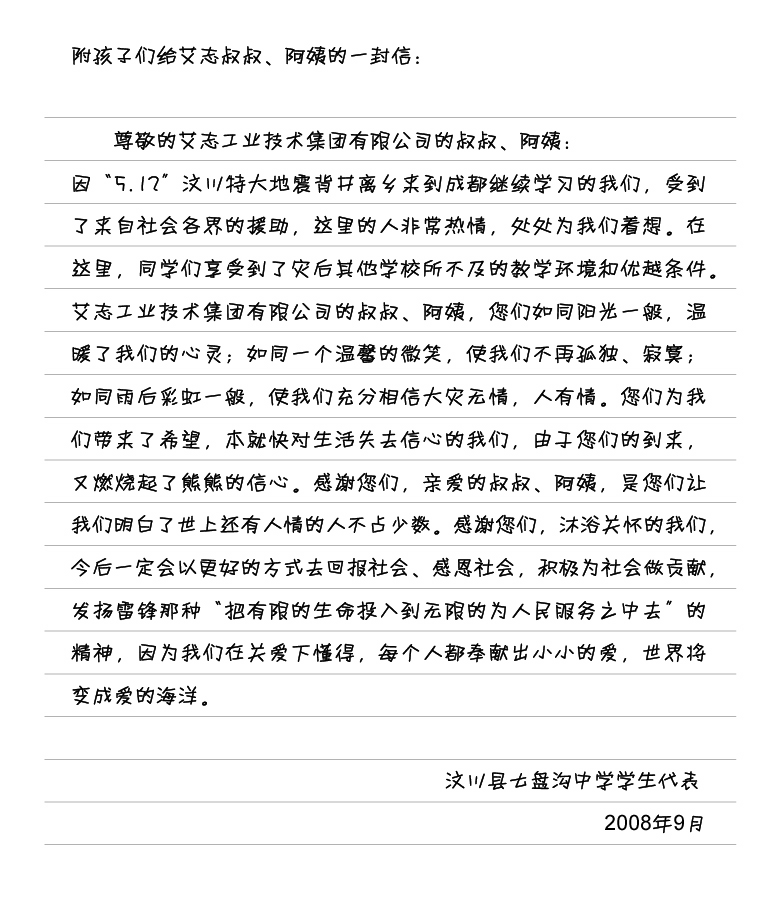 繼2008年8月29日艾志工業(yè)技術(shù)集團(tuán)有限公司在甘肅秦安縣第五中學(xué)頒發(fā)了第一期“艾志工業(yè)助學(xué)金”后,艾志工業(yè)技術(shù)集團(tuán)公司成都辦員工李兵、紀(jì)娟于9月12日上午九點(diǎn),在成都青龍場(chǎng)西南石油大學(xué)汶川縣七盤溝九年一貫制中學(xué)臨時(shí)安置點(diǎn)參加了第一期“艾志工業(yè)助學(xué)金”四川汶川頒發(fā)儀式。當(dāng)?shù)卣托7綄?duì)艾志工業(yè)技術(shù)集團(tuán)有限公司的善心表示熱烈歡飲和衷心感謝,汶川縣人民政府副縣長(zhǎng)王霞等有關(guān)領(lǐng)導(dǎo)出席了“艾志工業(yè)助學(xué)金”的頒發(fā)儀式并......